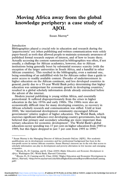 "Using African Journals Online (AJOL) as a case study – recently expanded to offer full text online and, with over 350 partner titles, now the world’s largest online collection of African journals – the author argues that increasing accessibility of African research outputs through open access, and sustained commitment to building partnerships, collaborations and networks amongst African stakeholders, with linkages between these and their overseas counterparts, are two pivotal and necessary conditions to move Africa away from the global knowledge periphery. In her conclusions she states “bibliographies, whether in print, or online, are also tools to allow access to information. It is the pro-active, systemic, organized and strategic use of these tools that will determine the future of Africa’s moving closer to the centre of the global knowledge system. To be accessible in the information age, African journals must ensure they are available, visible and usable on the internet, most particularly through striving towards open access of African-published materials, such that Africans themselves can read context-specific, relevant work from their own continent. Role-players in the continent’s system of knowledge generation and dissemination hold the ultimate responsibility and moral burden to build on existing capacity through cooperation and collaboration. It is only by addressing the complex and multiple requirements at all levels that optimal use of opportunities will be attained and the African continent will be brought to prominence in the global knowledge system." (Hans M. Zell, Publishing, Books & Reading in Sub-Saharan Africa, 3d ed. 2008, nr. 2566)
