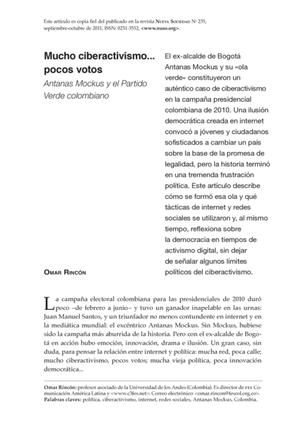 "El ex-alcalde de Bogotá Antanas Mockus y su «ola verde» constituyeron un auténtico caso de ciberactivismo en la campaña presidencial colombiana de 2010. Una ilusión democrática creada en internet convocó a jóvenes y ciudadanos sofisticados a cambiar un país sobre la base de la promesa de legalidad, pero la historia terminó en una tremenda frustración política. Este artículo describe cómo se formó esa ola y qué tácticas de internet y redes sociales se utilizaron y, al mismo tiempo, reflexiona sobre la democracia en tiempos de activismo digital, sin dejar de señalar algunos límites políticos del ciberactivismo." (Resumen)