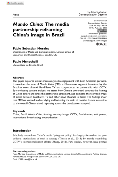 "This paper explores China’s increasing media engagement with Latin American partners. It examines the case of Mundo China (MC), a China-news segment broadcast by the Brazilian news channel BandNews TV and co-produced in partnership with CCTV. By conducting content analysis, we assess how China is presented, contrast the framing of China before and since the partnership agreement, and compare the televised image of China between BandNews TV and other news channels in Brazil. The findings show that MC has assisted in diversifying and balancing the ratio of positive frames in relation to the overall China-related reporting across the broadcasters sampled." (Abstract)