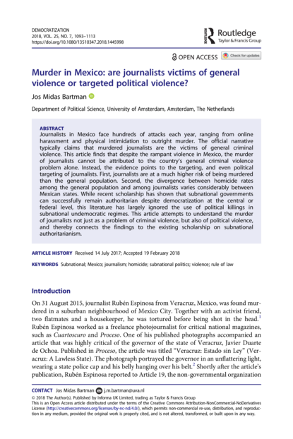 "Journalists in Mexico face hundreds of attacks each year, ranging from online harassment and physical intimidation to outright murder. The official narrative typically claims that murdered journalists are the victims of general criminal violence. This article finds that despite the rampant violence in Mexico, the murder of journalists cannot be attributed to the country's general criminal violence problem alone. Instead, the evidence points to the targeting, and even political targeting of journalists. First, journalists are at a much higher risk of being murdered than the general population. Second, the divergence between homicide rates among the general population and among journalists varies considerably between Mexican states. While recent scholarship has shown that subnational governments can successfully remain authoritarian despite democratization at the central or federal level, this literature has largely ignored the use of political killings in subnational undemocratic regimes. This article attempts to understand the murder of journalists not just as a problem of criminal violence, but also of political violence, and thereby connects the findings to the existing scholarship on subnational authoritarianism." (Abstract)