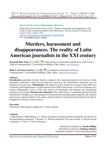 "Introduction: journalists in Latin America continue to face numerous threats in the exercise of their journalistic profession, which has increased the concern of the international community over its protection in recent years. Methodology: The objective of this research is to analyse nearly 500 cases of murders and disappearances in Latin America from 2000 to the present, as well as to elaborate on a profuse bibliographic review of the main sources of information and national and international programs in this regard. Results and conclusions: The results show a considerable gap between the international willingness to create programs for the protection and fight against impunity, the complex and insecure national realities in the region, and the number of information professionals who died or disappeared violently in Latin America." (Abstract)