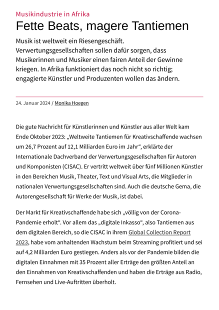 "Musik ist weltweit ein Riesengeschäft. Verwertungsgesellschaften sollen dafür sorgen, dass Musikerinnen und Musiker einen fairen Anteil der Gewinne kriegen. In Afrika funktioniert das noch nicht so richtig; engagierte Künstler und Produzenten wollen das ändern." (Einleitung)