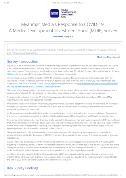 "In June 2020, MDIF conducted a survey of 36 Myanmar media outlets to gather information about the impact of COVID-19 on their businesses between March and May. They represent a mix of national media, as well as local media from the ethnic states and regions. Their operations are of various sizes: three media have 70-150 staff, 7 have 20-69, and 26 have 1-19. All the media surveyed felt the impact of COVID-19 almost immediately. Not surprisingly, as this has generally been the experience of media worldwide, commercial revenue decline was often dramatic: half of the survey respondents reported more than a 75% drop in income. Thirty-two of the 36 respondents had advertising revenue prior to the start of the pandemic, and all of them reported that it was negatively affected. All 19 media with print products were obliged to either reduce or even halt production. In response to collapsing revenues, 31 of the 36 survey respondents instituted spending cuts between March and May including, in some cases, cutting salaries and staff. Even as they reeled from the economic impact, Myanmar media also had to adapt their working environments. All the media surveyed quickly instituted work from home practices or else established social distancing in their offices and provided protective equipment for their staff. At the same time, more than half of the media reported having to contend with safety and security challenges. These came in the form of restrictions on movement, websites being blocked, on and offline surveillance, staff harassment and arrests. In common with media in other countries, one bright spot in this bleak picture has been audience growth. MDIF’s survey found that almost all media saw both their digital audiences, and audience engagement, increase. This had a positive knock-on effect for the media, with 30 respondents reporting that during this period they were able to strengthen their digital skills and knowledge due to the increased focus on their online content. The good news that 21 of the 31 respondents that sought emergency funding during the survey period obtained it, is tempered by the reality that the impact of COVID-19 has been deep and will be long lasting. The future for media in Myanmar is precarious." (Introduction)