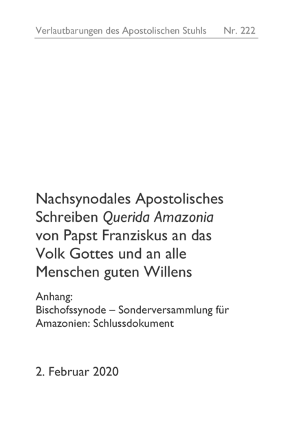 Nachsynodales Apostolisches Schreiben 'Querida Amazonia' von Papst Franziskus an das Volk Gottes und an alle Menschen guten Willens. Anhang: Bischofssynode – Sonderversammlung für Amazonien: Amazonien – Neue Wege für die Kirche und eine ganzheitliche Ökologie. Schlussdokument