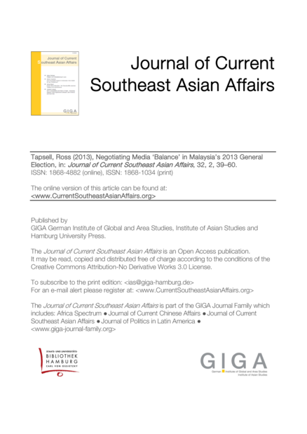 Journal of Current Southeast Asian Affairs, volume 32, issue 2 (2013), pp. 39-60