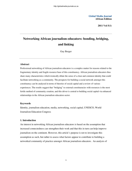 "Professional networking of African journalism educators is a complex matter for reasons related to the fragmentary identity and fragile resource base of this constituency. African journalism educators thus share many characteristics which ironically dilute the sense of a clear and common identity that could facilitate networking as a community. The prospects for building a social network amongst this constituency can be analysed in terms of theories of social capital and a review of various experiences. The results suggest that “bridging” to external constituencies with resources is the most fertile method of community creation, and this driver is central to building social capital via enhanced relationships in the African journalism education sector." (Abstract)