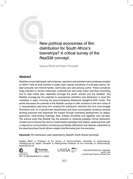 "ReaGilès are pre-fabricated, self-contained, education and entertainment complexes situated on 400m2 sites at local schools or public open spaces consisting of a 60-seat cinema, 30- seat computer and Internet facility, community care and policing centre. These complexes are intended to service historically underserviced peri-urban black dormitory townships of South Africa and to help create jobs, especially amongst the youth, women and the disabled. The ReaGilè concept, on roll-out, has the potential to revolutionise exhibition and distribution in local film industries in ways mirroring the ground-breaking Nollywood straight-to-DVD model. The article discusses the potential of the ReaGilè concept to offer solutions to the twin crises of 1) representation stemming from existing film distribution networks that limit micro-budget filmmakers, and 2) of government departments and local municipalities' tendency towards dividing practices that objectivise the subject through frustrating development via delays, paperwork, never-ending meetings, fees, endless formalities and legalities, and red tape. The authors posit that ReaGilè has the potential to creatively disrupt and redesign formal distribution models and to fracture the narrow modernisation paradigm they deploy, replacing them with a responsive communication re/ordering and flexible distribution that restore subjectivity to the disenfranchised South African subject (the filmmaker and audience from the township)." (Abstract)