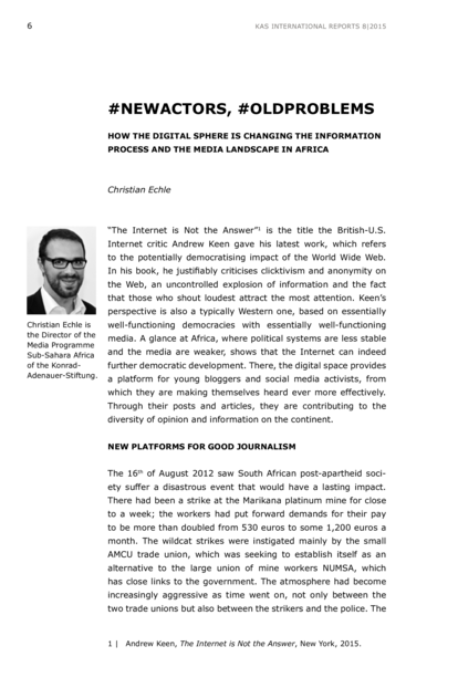 "Blogs and online content contribute significantly to opinion diversity in Africa today. Because of that, they are increasingly monitored by federal agencies, which aim to more strictly define the grey zone between journalism, blog-writing and opinion stating in social media. It is especially against this backdrop that digital opinion makers deserve more attention and support." (KAS website)
