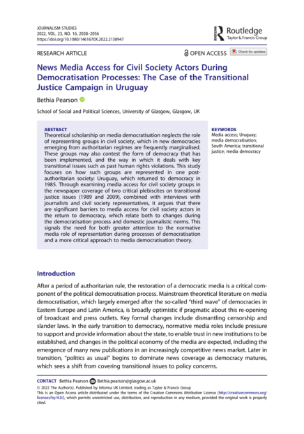 News Media Access for Civil Society Actors During Democratisation Processes: The Case of the Transitional Justice Campaign in Uruguay