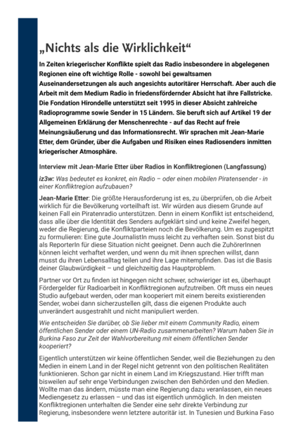 "In Zeiten kriegerischer Konflikte spielt das Radio insbesondere in abgelegenen Regionen eine oft wichtige Rolle - sowohl bei gewaltsamen Auseinandersetzungen als auch angesichts autoritärer Herrschaft. Aber auch die Arbeit mit dem Medium Radio in friedensfördernder Absicht hat ihre Fallstricke. Die Fondation Hirondelle unterstützt seit 1995 in dieser Absicht zahlreiche Radioprogramme sowie Sender in 15 Ländern. Sie beruft sich auf Artikel 19 der Allgemeinen Erklärung der Menschenrechte - auf das Recht auf freie Meinungsäußerung und das Informationsrecht. Wir sprachen mit Jean-Marie Etter, dem Gründer, über die Aufgaben und Risiken eines Radiosenders inmitten kriegerischer Atmosphäre." (Einleitung)