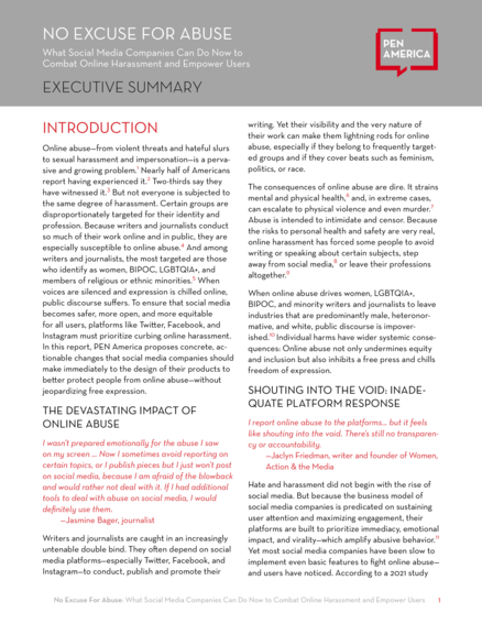 "To ensure that social media becomes safer, more open, and more equitable for all users, platforms like Twitter, Facebook, and Instagram must prioritize curbing online harassment. In this report, PEN America proposes concrete, actionable changes that social media companies should make immediately to the design of their products to better protect people from online abuse—without jeopardizing free expression." (Introduction)
