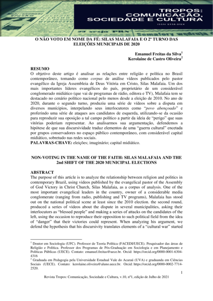 "O objetivo deste artigo é analisar as relações entre religião e política no Brasil contemporâneo, tomando como corpus de análise vídeos publicados pelo pastor evangélico da Igreja Assembleia de Deus Vitória em Cristo, Silas Malafaia. Um dos mais importantes líderes evangélicos do país, proprietário de um considerável conglomerado midiático (que vai de programas de rádio, editora e TV), Malafaia tem se destacado no cenário político nacional pelo menos desde a eleição de 2010. No ano de 2020, durante o segundo turno, produziu uma série de vídeos sobre a disputa em diversos munícipios, interpelando seus interlocutores como “povo abençoado” e proferindo uma série de ataques aos candidatos de esquerda, utilizando-se da ocasião para reproduzir sua oposição a tal campo político a partir da ideia de “perigo” que suas vitórias poderiam representar. Ao analisarmos sua argumentação, defendemos a hipótese de que sua discursividade traduz elementos de uma “guerra cultural” encetada por grupos conservadores no espaço público contemporâneo, com considerável capital midiático, sobretudo nas redes sociais." (Abstract)