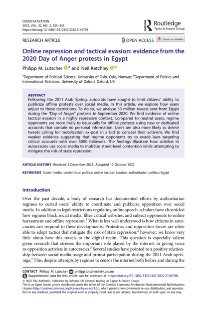 "Following the 2011 Arab Spring, autocrats have sought to limit citizens’ ability to publicize offline protests over social media. In this article, we explore how users adjust to these restrictions. To do so, we analyse 33 million tweets sent from Egypt during the “Day of Anger” protests in September 2020. We find evidence of online tactical evasion in a highly repressive context. Compared to neutral users, regime opponents are more likely to issue calls for offline protests using new or dedicated accounts that contain no personal information. Users are also more likely to delete tweets calling for mobilization ex-post in a bid to conceal their activism. We find weaker evidence suggesting that regime opponents try to evade laws targeting critical accounts with over 5000 followers. The findings illustrate how activists in autocracies use social media to mobilize street-level contention while attempting to mitigate the risk of state repression." (Abstract)