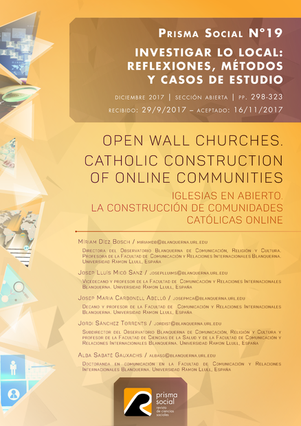 "From the Vatican itself, specifically through the Pope’s profiles on social media, Catholicism has proven to have an increasingly responsive presence on the web, although Catholics are usually creative without breaking the rules in the ways they extend their religiosity into new platforms. Newly born digital portals have embraced new participatory tools that shape other ways of understanding communion, which is a key concept among Christian communities. Rather than dwelling on whether Catholic portals are incorporating secular strategies to foster engagement, we explore the 19 most powerful Catholic websites according to Alexa ranking, and divide them into different categories that allow us to analyse how they build communities and thus foster the concept of belonging, which is one of the aims that they pursue. Data have been collected in three different moments (2014, 2015 and 2016) where these websites, belonging to 5 languages (Spanish, English, French, Portuguese and Italian) from 9 countries have been taken into account, according to Catholic population indexes." (Abstract)