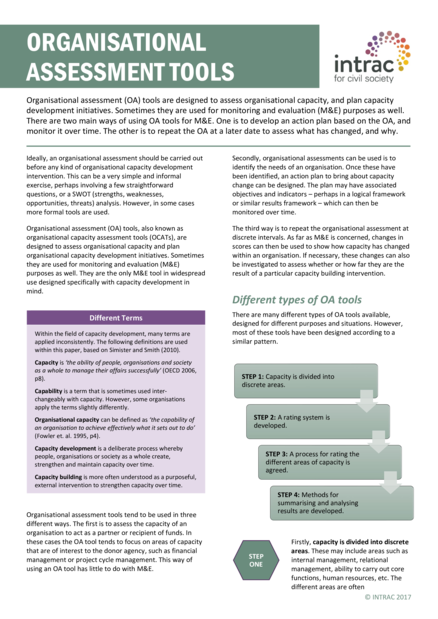 "Organisational assessment (OA) tools are designed to assess organisational capacity, and plan capacity development initiatives. Sometimes they are used for monitoring and evaluation (M&E) purposes as well. There are two main ways of using OA tools for M&E. One is to develop an action plan based on the OA, and monitor it over time. The other is to repeat the OA at a later date to assess what has changed, and why." (Introduction)