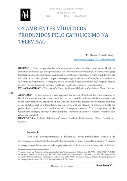 "Nesse artigo abordaremos o surgimento das televisões católicas no Brasil, os ambientes midiáticos que estas produzem e que influenciam na consolidação e expansão da Igreja Católica; os ambientes midiáticos com pouca ou nenhuma visibilidade, e como o catolicismo via televisão, de interfaces plurais, comporta consigo um potencial de transformações na constituição da cultura contemporânea. A pergunta chave levantada é: que catolicismo está surgindo através das televisões de inspiração católica? A reflexão e o debate acadêmico estão lançados." (Resumo)