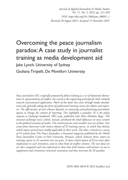 "Peace journalism (PJ), originally proposed by Johan Galtung as a set of ideational distinctions in representations of conflict, has served as the organizing principle for both scholarly research and practical application. Much of the latter has come through media development aid, generally taking the form of professional training courses for editors and reporters. The effectiveness of such schemes depends on activating and galvanizing journalistic agency to change the content of reporting. This highlights a paradox: PJ is the policy response to Galtung’s landmark 1965 essay, published with Mari Holmboe Ruge, ‘The structure of foreign news’, which, instead, attributed the chief influences on news content to the political economy of media. This article presents and considers two sets of data. One comes from interviews with sixteen alumni of PJ training courses, in which they disclose which aspects proved most readily applicable in their work. The other is based on a survey of 55 articles from The Peace Journalist, a biannual magazine published by the Global Peace Journalism Center at Park University, Missouri, which, between them, report on training courses in 33 countries over ten years. It shows which aspects of PJ are most often emphasized in such initiatives, and in what kind of conflict contexts. The two data sets are then compared and cross-referenced to show how both trainers and trainees set out to supplement and circumvent structural constraints and thus overcome the PJ paradox." (Abstract)