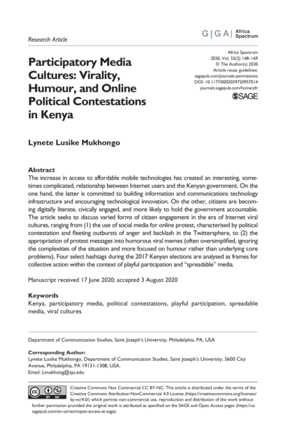 "The article seeks to discuss varied forms of citizen engagement in the era of Internet viral cultures, ranging from (1) the use of social media for online protest, characterised by political contestation and fleeting outbursts of anger and backlash in the Twittersphere, to (2) the appropriation of protest messages into humorous viral memes (often oversimplified, ignoring the complexities of the situation and more focused on humour rather than underlying core problems). Four select hashtags during the 2017 Kenyan elections are analysed as frames for collective action within the context of playful participation and “spreadable” media." (Abstract)
