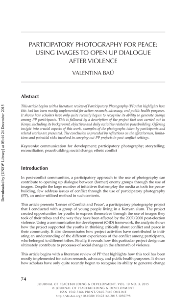 "This article begins with a literature review of Participatory Photography (PP) that highlights how this tool has been mostly implemented for action research, advocacy, and public health purposes. It shows how scholars have only quite recently begun to recognise its ability to generate change among PP participants. This is followed by a description of the project that was carried out in Kenya, including its background, objectives and daily activities related to peacebuilding. Offering insight into crucial aspects of this work, examples of the photographs taken by participants and related stories are presented. The conclusion is preceded by reflections on the effectiveness, limitations and potential risks involved in carrying out PP projects in post-conflict settings." (Abstract)