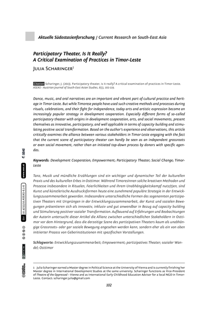 "Dance, music, and oral narratives are an important and vibrant part of cultural practice and heritage in Timor-Leste. But while Timorese people have used such creative methods and processes during rituals, celebrations, and their fight for independence, today arts and artistic expression become an increasingly popular strategy in development cooperation. Especially different forms of so-called participatory theater with origins in development cooperation, arts, and social movements, present themselves as innovative, participatory, and well applicable in terms of capacity building and stimulating positive social transformation. Based on the author’s experience and observations, this article critically examines the alliance between various stakeholders in Timor-Leste engaging with the fact that the current scene of participatory theater can hardly be seen as an independent grassroots or even social movement, rather than an initiated top-down process by donors with specific agendas." (Abstract)