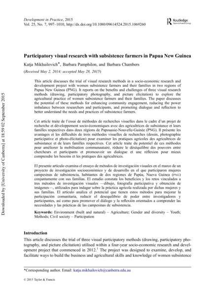 "This article discusses the trial of visual research methods in a socio-economic research and development project with women subsistence farmers and their families in two regions of Papua New Guinea. It reports on the benefits and challenges of three visual research methods (drawing, participatory photography, and picture elicitation) to explore the agricultural practice of women subsistence farmers and their families. The paper discusses the potential of these methods for enhancing community engagement, reducing the power imbalance between researchers and participants, and promoting dialogue and reflection to better understand the needs and practices of subsistence farmers." (Abstract)