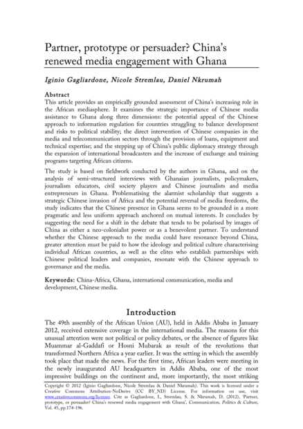 "This article provides an empirically grounded assessment of China’s increasing role in the African mediasphere. It examines the strategic importance of Chinese media assistance to Ghana along three dimensions: the potential appeal of the Chinese approach to information regulation for countries struggling to balance development and risks to political stability; the direct intervention of Chinese companies in the media and telecommunication sectors through the provision of loans, equipment and technical expertise; and the stepping up of China’s public diplomacy strategy through the expansion of international broadcasters and the increase of exchange and training programs targeting African citizens." (Abstract)