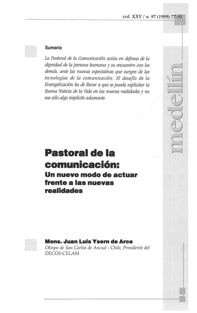 "La Pastoral de la Comunicación actúa en defensa de la dignidad de la persona humana y su encuentro con los demás ante las nuevas expectativas que surgen de las tecnologías de la comunicación. El desafío de la Evangelización ha de llevar a que se pueda explicitar la Buena Noticia de la Vida en las nuevas realidades y no sea sólo algo implícito solamente." (Sumario)
