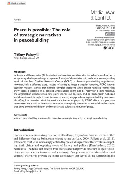 "In Bosnia and Herzegovina (BiH), scholars and practitioners often cite the lack of shared narrative as a primary challenge to long-term peace. A study of the multi-ethnic, collaborative story-telling work of the Post Conflict Research Centre (PCRC), a Bosnian peacebuilding organization, however, tells a different story. Instead of aiming to forge a singular narrative, PCRC weaves together multiple stories that express complex positions while driving narrative frames that show peace is possible. In a context where actors might not be ready for a joint narrative, the organization demonstrates how plural stories can co-exist, and be strategically mobilized and disseminated through diverse formats to actively engage others in peace-building processes. Identifying key narrative principles, tactics and frames employed by PCRC, this article proposes more attention is paid to how narrative can be strategically harnessed to de-stabilize the stories that drive entrenched division and to foster and cultivate a culture of peace." (Abstract)
