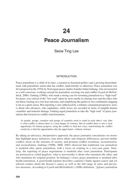 "Framing effects research has found that news consumers respond to journalists’ framing of a socially important event rather than to the actual event itself. Peace journalism, as a conscious and deliberate act by journalists, can offer significant insights on a hitherto unexplored aspect of framing theory. Indeed, if framing can be a conscious act involving intent, journalists must then confront the issues of moral accountability, and can no longer seek refuge in the notion that how they cover the news is merely shaped by journalistic routines, social norms, and organizational cultures and constraints that are beyond their control. Tehranian (2002) suggests that the locus of media ethics be expanded from the individual journalist to institutions, nation-states and international communities in order to advance peace journalism. This is a laudable proposal indeed, as more is needed institutionally, be it in the form of infrastructure or sanction, to support ethical journalistic work. But until journalists covering war and conflict are willing to acknowledge and overcome their internal biases and external influences, rethink their over-reliance on objectivity and detachment, and break free of the professional shackles that detract from universal proto-norms of nonviolence and respect for human dignity, peace journalism will always remain a child of its time, never to come of age." (Pages 368-369)
