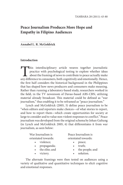 "This interdisciplinary article weaves together journalistic practice with psychological testing to explore whether ideas about the framing of news to contribute to peace actually make any difference to consumers, both cognitively and emotionally. Hence, the first half considers the historical background in the Philippines that has shaped how news producers and consumers make meaning. Rather than running a laboratory-based study, researchers worked in the field, in the TV newsroom of Davao-based ABS-CBN, utilizing material already broadcast. This material could be defined as “war journalism,” thus enabling it to be reframed as “peace journalism." (Introduction)