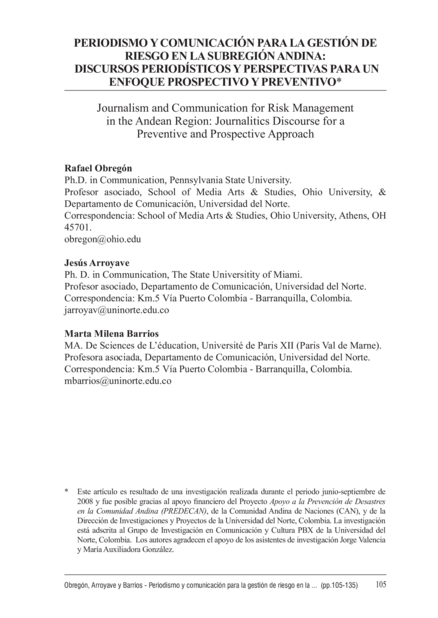 Periodismo y comunicación para la gestión de riesgo en la subregión andina: Discursos periodÃsticos y perpsectivas para un enfoque prospectivo y preventivo