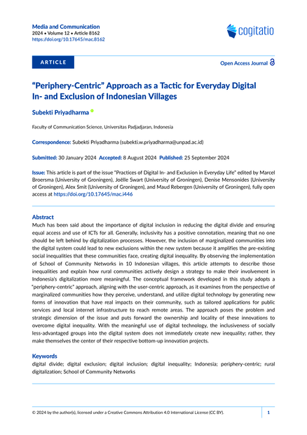 "Much has been said about the importance of digital inclusion in reducing the digital divide and ensuring equal access and use of ICTs for all. Generally, inclusivity has a positive connotation, meaning that no one should be left behind by digitalization processes. However, the inclusion of marginalized communities into the digital system could lead to new exclusions within the new system because it amplifies the pre-existing social inequalities that these communities face, creating digital inequality. By observing the implementation of School of Community Networks in 10 Indonesian villages, this article attempts to describe those inequalities and explain how rural communities actively design a strategy to make their involvement in Indonesia's digitalization more meaningful. The conceptual framework developed in this study adopts a "periphery-centric" approach, aligning with the user-centric approach, as it examines from the perspective of marginalized communities how they perceive, understand, and utilize digital technology by generating new forms of innovation that have real impacts on their community, such as tailored applications for public services and local internet infrastructure to reach remote areas. The approach poses the problem and strategic dimension of the issue and puts forward the ownership and locality of these innovations to overcome digital inequality. With the meaningful use of digital technology, the inclusiveness of socially less?advantaged groups into the digital system does not immediately create new inequality; rather, they make themselves the center of their respective bottom-up innovation projects." (Abstract)