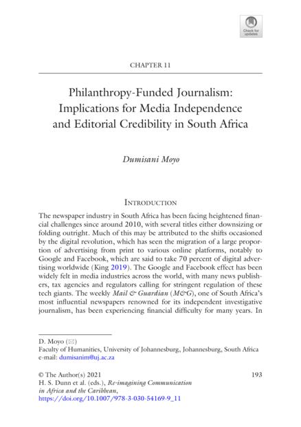 "Over the past decade, philanthropic organisations have poured millions of dollars into different specialised forms of journalism in Africa. While these new specialised forms of journalism are aimed at addressing existing gaps in news reporting on the continent, there has been growing concern over the potential effects this has on the practice of journalism. This study explores the rise in philanthropy-funded journalism and analyses its broader implications for the practice of journalism in South Africa, focusing on the weekly Mail & Guardian newspaper and its two off-shoots, AmaBhungane Centre for Investigative Journalism and Bhekisisa Centre for Health Journalism. It is based on a combination of informant interviews with editors and managers of these three entities, secondary research, as well as analysis of documents from these entities." (Abstract)