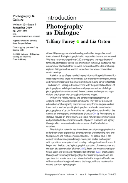 "About 10 years ago we started sending each other images, back and forth, via email. Each photograph had to respond to the one just received. We have so far exchanged over 260 photographs, sharing snippets of family life, abstraction, travels, loss and humor. When we started, we had no particular plan but rather we were curious about the idea of photography as dialogue and we wanted to see how our visual conversation would develop. A similar sense of open-ended inquiry informs this special issue which does not present a single resolved idea but explores the emergent, messy and indeterminate ways that images and image-making serve to facilitate – and obscure – dialogue. It is concerned with the potential and limits of photography as a dialogical medium and proposes an idea of dialogic photography that centres around the encounters, exchanges and negotiations that happen with, through and around images." (Abstract)