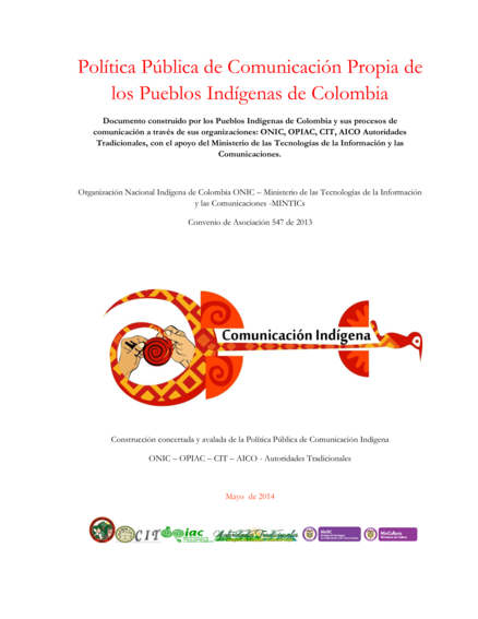 Política pública de comunicación propia de los pueblos indígenas de Colombia. Documento construido por los Pueblos Indígenas de Colombia y sus procesos de comunicación a través de sus organizaciones: ONIC, OPIAC, CIT, AICO Autoridades Tradicionales, con el apoyo del Ministerio de las Tecnologías de la Información y las Comunicaciones