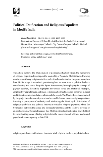 "The article explores the phenomenon of political deification within the framework of religious populism, focusing on the leadership of Narendra Modi in India. Drawing on discourse theory, religious studies, and critical media studies, the paper examines how Modi’s image is sacralized, positioning him as more than a political leader – transforming him into a deity-like figure. Furthermore, by employing the concept of populist darshan, the article highlights how Modi’s visual and rhetorical strategies, amplified by digital media and mass communication technologies, construct a direct and intimate connection between him and the people. The Modi effect, characterized by the projection of an omnipresent and accessible leader, mirrors religious practices, fostering a perception of authority and reinforcing the Modi myth. This fusion of religious symbolism and political rhetoric is central to religious populism, where the boundaries between the sacred and the secular are fluid, and the leader is elevated to an exalted status. The article argues that Modi’s political deification is a powerful tool in consolidating power, offering insights into the intersection of religion, media, and populism in contemporary political life." (Abstract)
