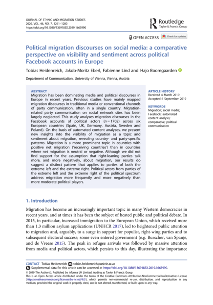 "Migration has been dominating media and political discourses in Europe in recent years. Previous studies have mainly mapped migration discourses in traditional media or conventional channels of party communication, often in a single country. Migrationrelated party communication on social network sites has been largely neglected. This study analyses migration discourses in the Facebook accounts of political actors (n = 1702) across six European countries (Spain, UK, Germany, Austria, Sweden and Poland). On the basis of automated content analyses, we present new insights into the visibility of migration as a topic and sentiment about migration, revealing country- and party-specific patterns. Migration is a more prominent topic in countries with positive net migration (‘receiving countries’) than in countries where net migration is neutral or negative. Although we did not find support for the assumption that right-leaning parties talk more, and more negatively, about migration, our results do suggest a distinct pattern that applies to parties of both the extreme left and the extreme right. Political actors from parties of the extreme left and the extreme right of the political spectrum address migration more frequently and more negatively than more moderate political players." (Abstract)
