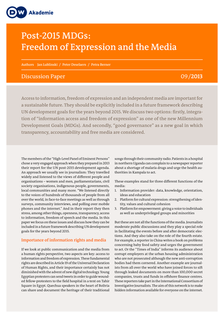 "Access to information, freedom of expression and an independent media are important for a sustainable future. They should be explicitly included in a future framework describing UN development goals for the years beyond 2015. We discuss two options: firstly, integration of “information access and freedom of expression” as one of the new Millennium Development Goals (MDGs). And secondly, “good governance” as a new goal in which transparency, accountability and free media are considered." (Abstract)