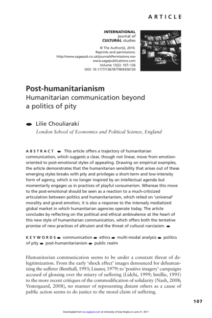 "This article offers a trajectory of humanitarian communication, which suggests a clear, though not linear, move from emotion-oriented to post-emotional styles of appealing. Drawing on empirical examples, the article demonstrates that the humanitarian sensibility that arises out of these emerging styles breaks with pity and privileges a short-term and low-intensity form of agency, which is no longer inspired by an intellectual agenda but momentarily engages us in practices of playful consumerism. Whereas this move to the post-emotional should be seen as a reaction to a much-criticized articulation between politics and humanitarianism, which relied on ‘universal’ morality and grand emotion, it is also a response to the intensely mediatized global market in which humanitarian agencies operate today. The article concludes by reflecting on the political and ethical ambivalence at the heart of this new style of humanitarian communication, which offers both the tentative promise of new practices of altruism and the threat of cultural narcissism." (Abstract)
