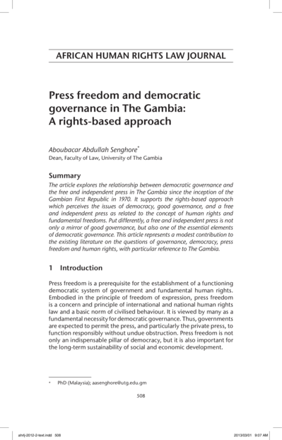 "The article explores the relationship between democratic governance and the free and independent press in The Gambia since the inception of the Gambian First Republic in 1970. It supports the rights-based approach which perceives the issues of democracy, good governance, and a free and independent press as related to the concept of human rights and fundamental freedoms. Put differently, a free and independent press is not only a mirror of good governance, but also one of the essential elements of democratic governance. This article represents a modest contribution to the existing literature on the questions of governance, democracy, press freedom and human rights, with particular reference to The Gambia." (Abstract)