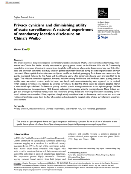 "This article examines the public response to mandatory location disclosure (MLD), a new surveillance technology implemented on China’s Sina Weibo. Initially introduced to geo-tag posts related to the Ukraine War, the MLD eventually expanded to encompass all posts and comments on the platform. Drawing on a large-scale dataset comprising over 0.6 million posts and 24 million comments, this study uncovers political asymmetry observed during the initial implementation of MLD. Users with different political orientations were subjected to different levels of geo-tagging. Pro-Ukraine users were most frequently geo-tagged, followed by Pro-Russia and liberal-leaning users, while conservative-leaning users are least likely to be tagged. This selective surveillance approach, however, backfired among Pro-Ukraine and Pro-Russia users, pushing them to publish more war-related content, while its impact on liberal- and conservative-leaning users appeared to be minimal. When selective surveillance was replaced by universal surveillance, the backfire effects ceased to exist and people’s interest in war-related topics declined. Furthermore, privacy cynicism prevails among commenters across opinion groups. Neither the introduction nor the expansion of MLD deterred audiences from engaging with the geo-tagged posts. These findings suggest that prolonged surveillance makes people less sensitive to privacy threats and more experienced in neutralizing surveillance’s influence on themselves. Privacy cynicism, though widely considered toxic to democracy, can function as a source of resilience that shields people from the fear of coercion and undercuts the marginal utility of state surveillance in an authoritarian context." (Abstract)