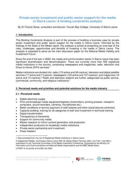 "This Binding Constraints Analysis is part of the process of building a business case for private sector investment and public sector support for the media in Sierra Leone. Informed by the findings of the State of the Media report, this analysis is aimed at presenting an overview of the risks, challenges, opportunities and benefits of investing in the media in Sierra Leone. The analysis is expected to serve as the main discussion paper for the National Media Viability and Investment Forum." (Introduction, page 1)