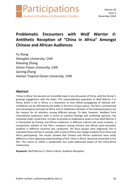 "China in Africa’ has become an irresistible topic in any discussion of China, with the former’s growing engagement with the latter. The unprecedented popularity of Wolf Warrior II in China, which is set in Africa, is a testament to how official propaganda of national selfconfidence can be affirmed by the public in the form of pop culture. The film’s controversial and stereotypical portrayal of Africa and its deliberate imitation of the Hollywood genre are the reasons for its attention among different groups. To date, however, feedback from international audiences, both in terms of common feelings and conflicting opinions, has remained under-researched. In order to provide an exploratory study on how Wolf Warrior II is interpreted by Chinese and African audiences in different cultural and social contexts, a comparative analysis of the film’s reception among Chinese and African post-secondary students in different countries was conducted. Ten focus groups were organised, five in mainland China and five in Canada, with a total of thirty-one college students from China and Africa participating. The results showed that Chinese and African audiences have vastly different or even opposing understandings of the ‘China in Africa’ discourse presented in the film. This seems to reflect a problematic but under-addressed aspect of the China-Africa relationship." (Abstract)
