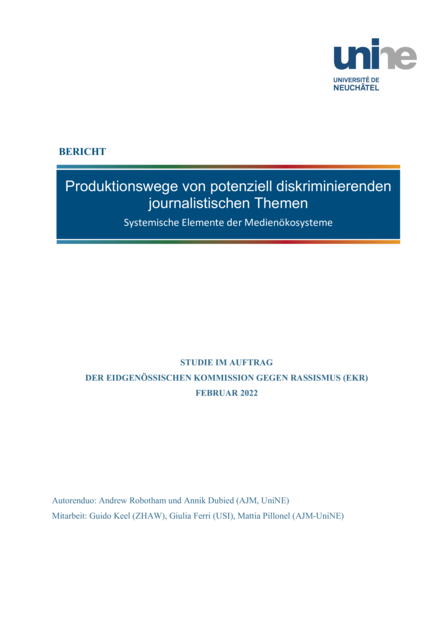 "Dieser Bericht vertieft die Ergebnisse einer Medienanalyse, bei der zu pädagogischen Zwecken (gute wie schlechte) Beispiele von Medienberichterstattung im Zusammenhang mit rassistischer Diskriminierung in Schweizer Nachrichtenmedien zusammengetragen wurden. […] Diese Studie stützt sich auf detaillierte Untersuchungen von drei Artikeln mit diskriminierenden Auswirkungen. Sie umfasst die Analyse der Artikel selbst (Diskursanalyse) und vertiefte Gespräche (Forschungsinterviews) mit den Autorinnen bzw. Autoren der Artikel, weiteren Journalistinnen und Journalisten sowie Mitgliedern der Redaktion, die für den jeweiligen Artikel zuständig war. Diese Interviews ermöglichten es, die wichtigsten Schritte bei der Produktion von Nachrichten, die als diskriminierungssensibel bezeichnet werden können, nachzuvollziehen und die dabei wirksamen Berufspraktiken und -logiken zu identifizieren." (Vorwort, iii & Abstract iv)