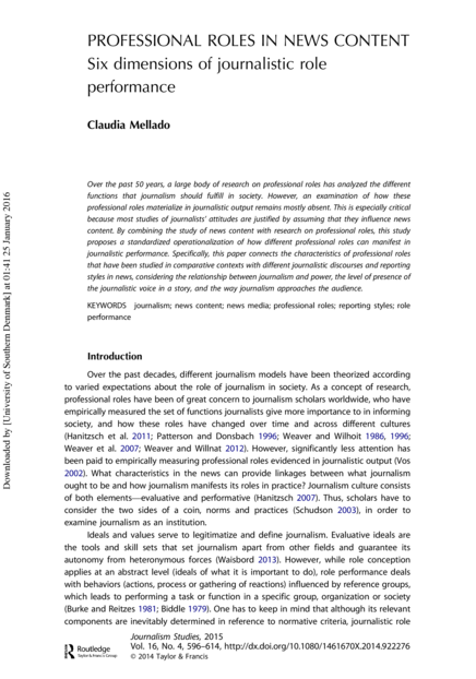 "Over the past 50 years, a large body of research on professional roles has analyzed the different functions that journalism should fulfill in society. However, an examination of how these professional roles materialize in journalistic output remains mostly absent. This is especially critical because most studies of journalists’ attitudes are justified by assuming that they influence news content. By combining the study of news content with research on professional roles, this study proposes a standardized operationalization of how different professional roles can manifest in journalistic performance. Specifically, this paper connects the characteristics of professional roles that have been studied in comparative contexts with different journalistic discourses and reporting styles in news, considering the relationship between journalism and power, the level of presence of the journalistic voice in a story, and the way journalism approaches the audience." (Abstract)