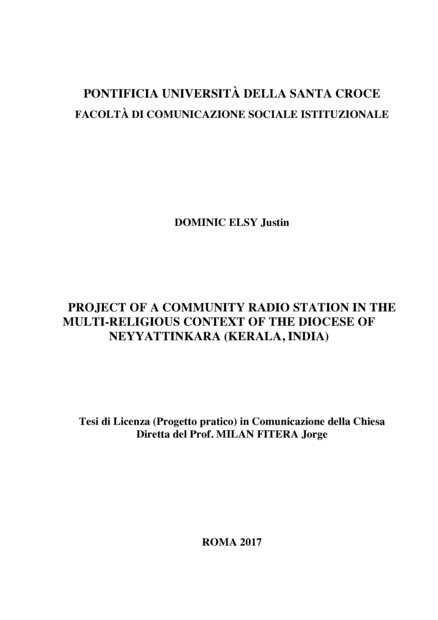 "First chapter explained the concept of CR and those three key aspects such as: non-profit, community ownership and management, and community participation [...] Second chapter spoke entirely about the situation of CR in India. It has emphasised the history and growth of CR in India through six phases begin from 1995 up to 2017 [...] Third Chapter began with explaining the approach, influence and assistance of the Government of India towards CR and its establishing process. The process of getting licence is briefed in 12 steps [...] Fourth chapter brought out a description about the context of the Diocese of Neyyattinkara and the CR project in specific. It makes clear that CR is not about doing something for the community rather the community doing something for itself [...] Fifth chapter spoke about those features Nids CR wants to promote based on the Church documents such as: Mirada Prorsus, Inter Mirifica, Communio et Progressio, Redemptoris Missio and Aetatis Novae; and the Radio Manifesto of World Radio Forum [...] Sixth chapter is a proposal based on conceptual analyses about the administrative structure, role of definite members, importance of volunteers, probable expenditure and fund raising options ..." (General conclusion, page 143 ff.)