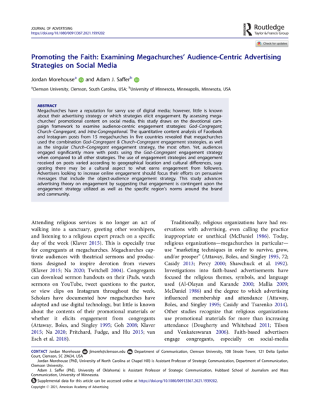 "Megachurches have a reputation for savvy use of digital media; however, little is known about their advertising strategy or which strategies elicit engagement. By assessing megachurches’ promotional content on social media, this study draws on the devotional campaign framework to examine audience-centric engagement strategies: God–Congregant, Church–Congregant, and Intra-Congregational. The quantitative content analysis of Facebook and Instagram posts from 15 megachurches in five countries [Australia; New Zealand; United Kingdom; United States; Canada] revealed that megachurches used the combination God–Congregant & Church–Congregant engagement strategies, as well as the singular Church–Congregant engagement strategy, the most often. Yet, audiences engaged significantly more with posts using the God–Congregant engagement strategy when compared to all other strategies. The use of engagement strategies and engagement received on posts varied according to geographical location and cultural differences, suggesting there may be a cultural aspect to what earns engagement from followers. Advertisers looking to increase online engagement should focus their efforts on persuasive messages that include the object-audience engagement strategy. This study advances advertising theory on engagement by suggesting that engagement is contingent upon the engagement strategy utilized as well as the specific region’s norms around the brand and community." (Abstract)