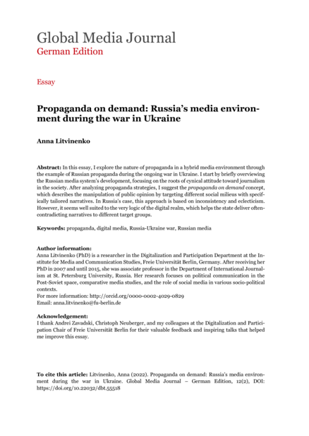 "In this essay, I explore the nature of propaganda in a hybrid media environment through the example of Russian propaganda during the ongoing war in Ukraine. I start by briefly overviewing the Russian media system’s development, focusing on the roots of cynical attitude toward journalism in the society. After analyzing propaganda strategies, I suggest the propaganda on demand concept, which describes the manipulation of public opinion by targeting different social milieus with specif-ically tailored narratives. In Russia’s case, this approach is based on inconsistency and eclecticism. However, it seems well suited to the very logic of the digital realm, which helps the state deliver often-contradicting narratives to different target groups." (Abstract)