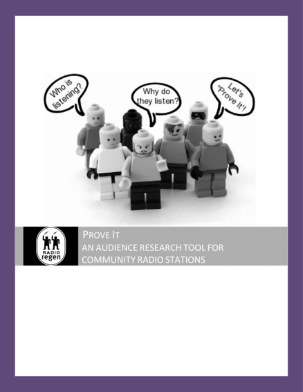 "The Prove It toolkit is a resource for community radio stations to enable them to conduct their own audience research. It provides stations with the information and expertise to both measure their audience listener figures and assess the impact that they are having on their community of listeners." (Page 4)
