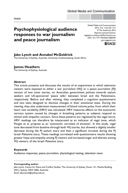 "This article presents and discusses the results of an experiment in which television viewers were exposed to either a war journalism (WJ) or a peace journalism (PJ) version of two news stories, on Australian government policies towards asylum seekers and US-sponsored ‘peace talks’ between Israel and the Palestinians, respectively. Before and after viewing, they completed a cognitive questionnaire and two tests designed to disclose changes in their emotional state. During the viewing, they also underwent measurement of blood volume pulse, from which their heart rate variability (HRV) was calculated. HRV measures effects on the autonomic nervous system caused by changes in breathing patterns as subjects respond to stimuli with empathic concern. Since these patterns are regulated by the vagal nerve, HRV readings can therefore be interpreted as an indicator of vagal tone, which Porges et al. propose as an ‘autonomic correlate of emotion’. In this study, vagal tone decreased from baseline through both WJ stories, but showed a slightly smaller decrease during the PJ asylum story and then a significant increase during the PJ Israel–Palestine story. These readings correlated with questionnaire results showing greater hope and empathy among PJ viewers and increased anger and distress among WJ viewers, of the Israel–Palestine story." (Abstract)